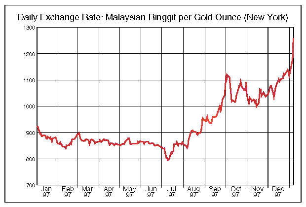 Please recall my last report - only three weeks ago - showed an average 45% increase gold price in the beleaguered currencies. In less than one month the average gold price in these battered currencies soared even further to +76.3% from early 1997. GOLD has, and continues to offer positive refuge from crumbling currencies and the falling stock markets of Southeast Asia. (Note: Charts reflect data through January 6, 1998)