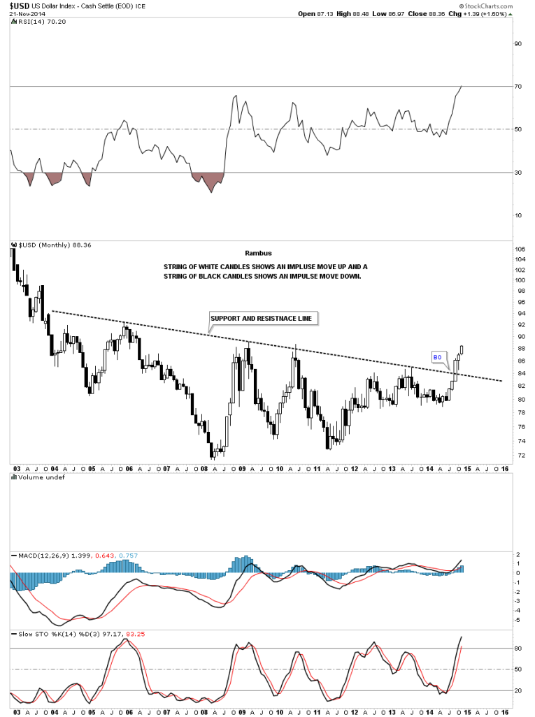Below is a long term monthly chart for the US dollar that shows black and white candlesticks. In a strong impulse move down you will see a string of back candles all in a row and in a strong impulse move up you will see a string of white candles all in a row. If the US dollar doesn’t crash and burn during this last week of trading for November, it will have completed it sixth month in a row of white candles sticks. This is telling us the breakout move from the massive ten year base is underway and is looking healthy. Remember big bases equals a big move and a small base equals a small move. It’s all relative.