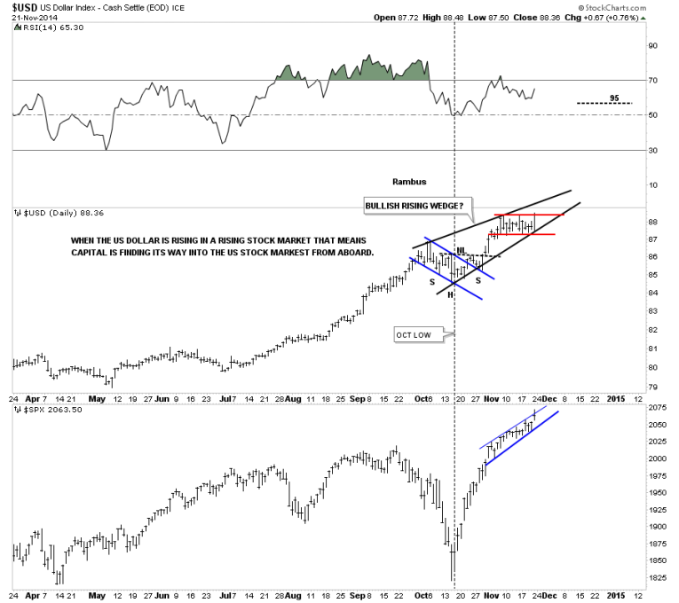 There is an old adage on Wall Street that says if you see the US dollar and the stock market rising together that is bullish for the stock market because capital from overseas is finding its way to the US markets. Since the October low both the US dollar and the SPX have been rising together. Coincidence?