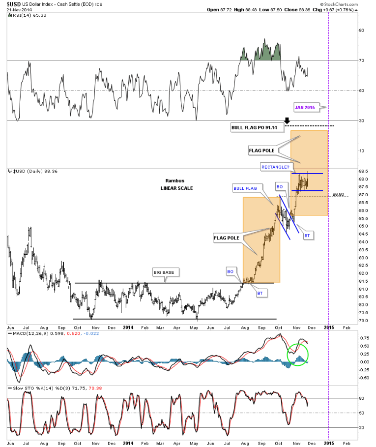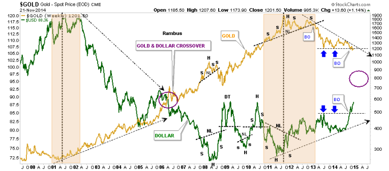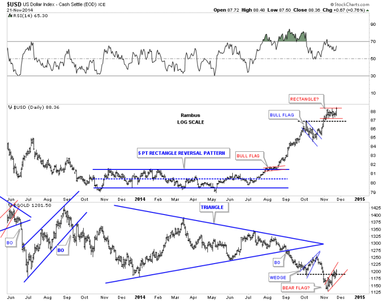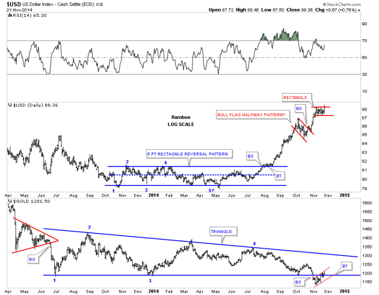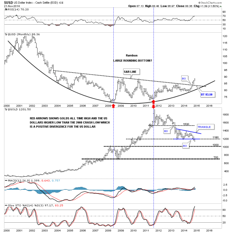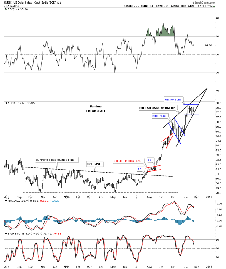 So there you have it. The next couple of weeks are going to be very telling on which way all the falling wedges I showed you are going to break. Time always tells the story in hindsight but we can’t use hindsight in trading the markets. So until something changes this is how I see the big picture unfolding over the short to long term for the US dollar. How this affects other areas of the markets will remain to be seen yet. Normally a strong dollar is bad for commodities and the precious metals complex. Will this time be any different. Stay tuned to find out. All the best…Rambus