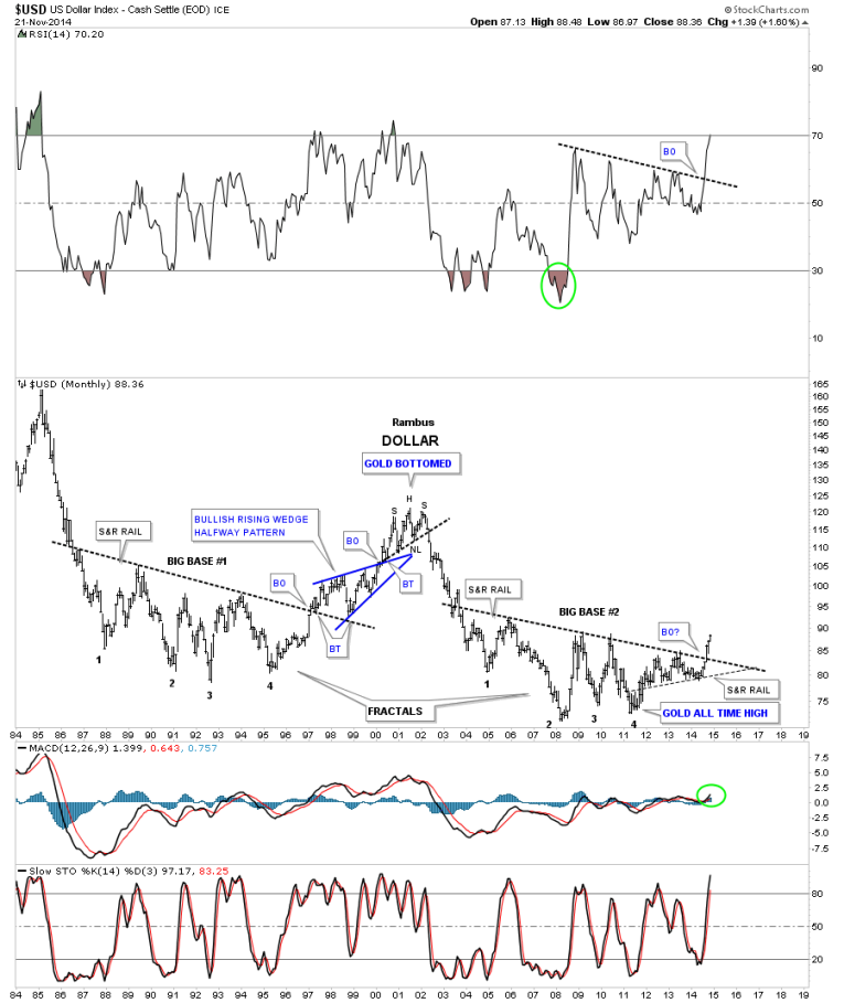 The next long term chart for the US dollar is a monthly look going all the way back to 1984 which shows its all time high around 160 or so. As the US dollar declined from its all time highs it began to form a huge base which I labeled as, Big Base #1. When the dollar broke out of that big base #1 it led to a move to the 120 area in 2000 which started the bull market in the precious metals complex and the stock markets started their cyclical bear markets. The move above the big base #1 S&R line, support and resistance line, lasted about three years. The US dollar built out a beautiful blue bullish rising wedge that formed at the halfway point to the 2000 top. The ride up wasn’t an easy one as you can see from all the chopping action during the formation of the blue rising wedge and this is a monthly chart. The big base #1 had two backtest to the S&R line before the impulse move really got going up to the 120 top. We have a well defined line in the sand now. As long as the US dollar trades above big base #2 S&R line it will remain in bullish mode.