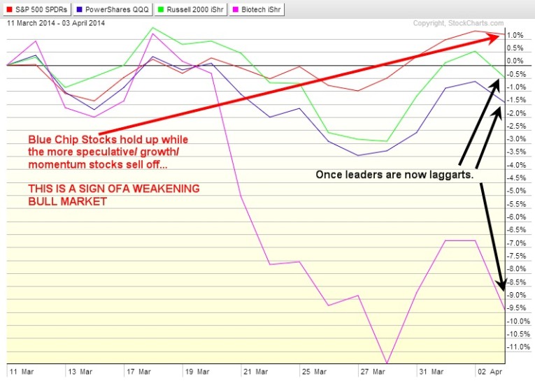 This is a sign that the active investors/traders and hedge funds are rotating their money out of these higher beta stocks to lock in gains and are moving their money into the more stable blue chips in anticipation of a market correction.