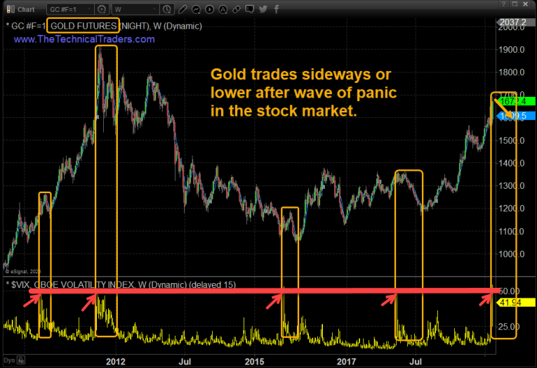 This chart shows what happens to the price of gold when everyone becomes fearful. Gold tends to rally as fear rises and the VIX spikes. But once the VIX has spiked the price of gold will trade sideways for many weeks and eventually have a deeper correction.