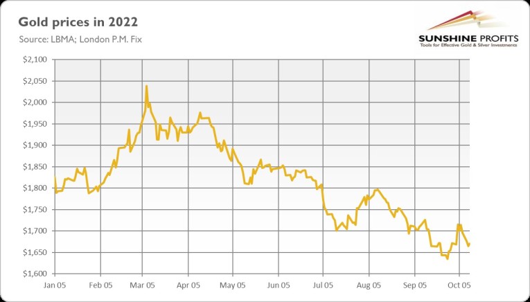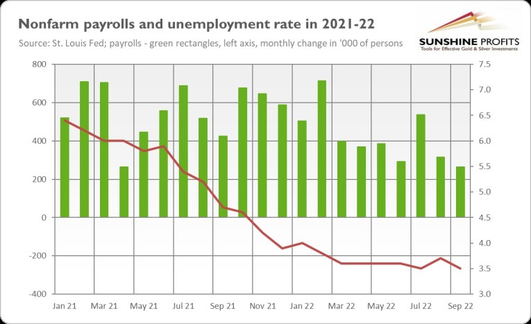 The US labor market added 263,000 jobs in September, according to the BLS. The number was lower than in August (+315,000) and came slightly below expectations (275,000). However, job growth has averaged 420,000 per month this year and the U.S. labor market continues to show resilience during the Fed’s tightening cycle. What’s more, the unemployment rate declined from 3.7 to 3.5%, as the chart below shows. The drop was largely caused by a decline in labor participation, but the labor market remains relatively tight, allowing the Fed to hike the federal funds rate again. Hence, gold prices could remain under downward pressure.
