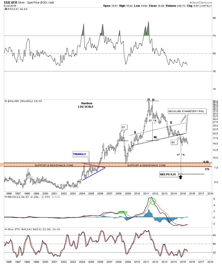 As with gold silver to has a massive H&S top in place. It too has some very nice symmetry as show by the neckline symmetry rail which shows the height for the left and right shoulders. My game plan is to shoot for the brown shaded support and resistance zone. If silver makes it that low I’ll be satisfied.