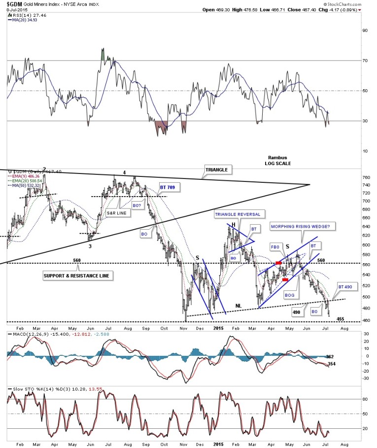 This next chart is a daily look at the GDM which shows the combo triangle / H&S consolidation pattern that started to form at the November low from last year. It’s easy to see in hindsight now how all the pieces of the puzzle fit together. Note the breakout from the triangle, black solid trendline, eight days ago was quickly followed by the breakout below the neckline three days later. This past Monday was the backtest day that tested the neckline. This chart shows you the game play we’ve been following since May which is still working according to the Chartology. If for some unexpected reason the price action starts trading above the neckline and the bottom rail of the black rectangle then the game plan will have changed and I will have to adapt to what the chart is saying at that time. So far so good.
