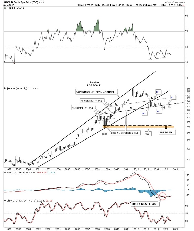 I’ve been showing you this long term monthly chart for gold shortly after it broke down from the bearish expanding rising wedge almost two years ago. Longer term members may remember when I added the neckline extension rail that is taken from the 2008 H&S consolidation pattern and extended it out in time to the right hand side of the chart. The symmetry was just too pretty to ignore as shown by the neckline symmetry rails. They’re all the exact same angle which shows the bottoms of the left and right shoulders of the 2008 H&S consolidation pattern, which is also the same angle for the neckline, which also shows the highs for the left and right shoulders of the massive H&S top and its neckline. The breaking and backtesting process has been going on for close to a year now but this is a massive H&S top that is in play as big patterns take a lot time to develop. Now it’s getting time for gold to break to new lows since its bear market began in September of 2011. That will confirm the game plan.