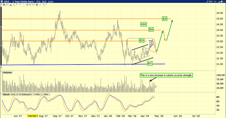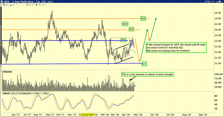 I have two short term scenarios for GDX. The first involves the current pullback ending in the $22 area, and the second one shown here has the pullback end at around $21. Put options enthusiasts and those carrying a short position in GDX against their portfolio of individual miners could cover off half the puts at around $22 and the rest near $21.