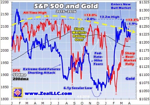 All this culminated with gold soaring 17.5% in the first 6 weeks or so of 2016 while the flagship S&P 500 stock index plunged 10.5%. The false belief carefully cultivated by central bankers in recent years that they can engineer stock markets to rise indefinitely without material selloffs was starting to implode. So even American stock investors defied their endless Wall Street anti-gold training to flock back to gold.