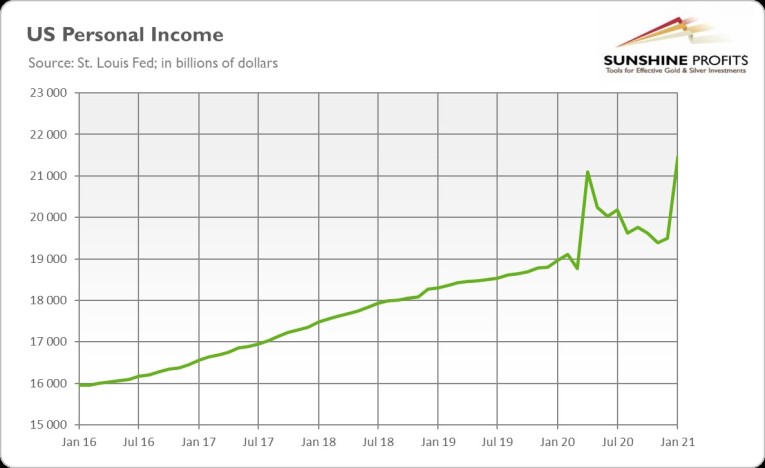 What does this all mean for gold prices? From the fundamental point of view, Biden’s plan should be positive for the yellow metal. This is because it can increase inflation in the long-run, if people finally decide to spend all the money they got from Uncle Sam. It will not happen in the immediate future, as households will initially save the received payments, and some of them will repay their debts, but they are likely to spend more this year, to compensate for curbed consumption in 2020.
