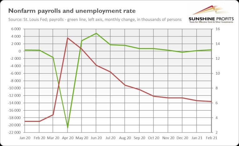 Indeed, the U.S. economy is already recovering. On Friday (Mar. 5), we got surprisingly good data about the American labor market, that showed the economy added 379,000 jobs in February, much above expectations. Meanwhile, the unemployment rate has slightly decreased further, as one can see in the chart below. Employment is still down by 9.5 million, or 6.2 percent, from the pre-pandemic level seen one year ago, but additional unemployment benefits or plain checks will not help bring people back into employment – in fact, the effect may turn out to be the reverse.