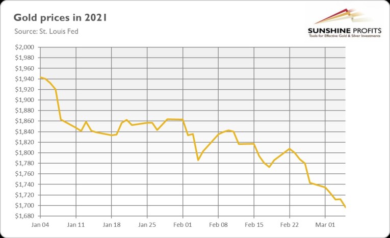 However, gold remains deaf to Biden’s disharmonious symphony. Indeed, as the chart below shows, the yellow metal has declined below the important level of $1,700 last week. It seems that the fiscal stimulus (together with the rollout of vaccinations and the economic recovery) has so far strengthened the risk appetite among investors who don’t focus on long-term consequences of the fiscal stimulus.