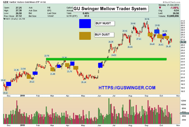 For traders who want more action, my www.guswinger.com mellow and aggressive trade signals service may be the answer. Keying off the GDX chart, we are almost always in NUGT or DUST and JNUG or JDST. I run a tight ship, and when the next big run happens, the profits should be immense.