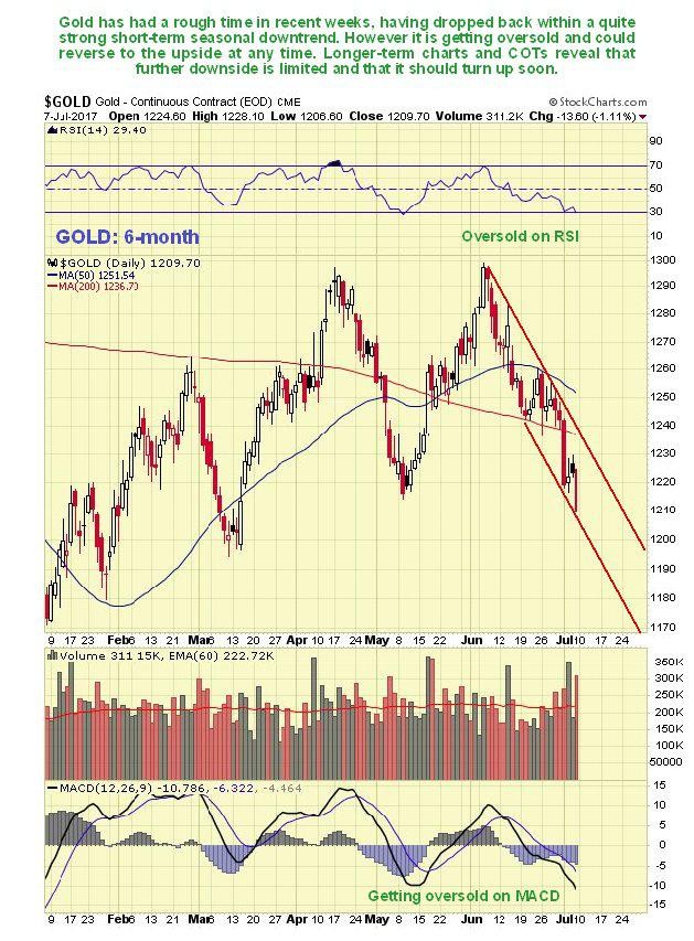 On the latest 6-month gold chart we can see the downtrend in force from early June which on Friday took the price beneath the May low. Moving averages are in bearish alignment…but gold is now oversold on its RSI and getting oversold on its MACD indicator.