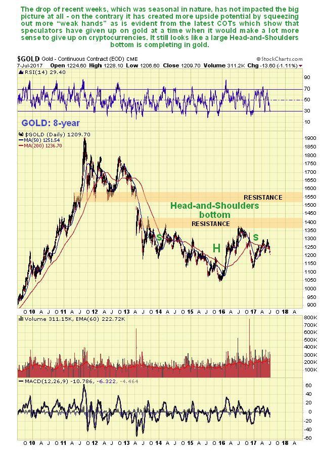 The long-term 8-year chart continues to show a large Head-and-Shoulders bottom completing in gold, and on this chart the drop of recent weeks looks miniscule and as we can see, it has not impacted this big picture at all. If this interpretation is correct, then we are an excellent point to buy here from a price / time perspective. It is rather amazing to think that this bottoming pattern in gold started to form way back in mid-2013.