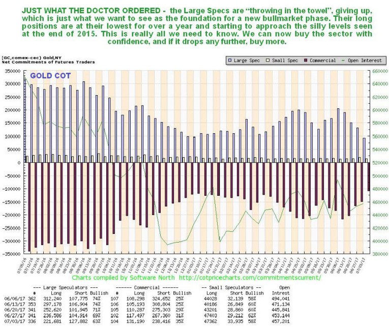 Gold’s latest COT chart looks increasingly bullish, with the Large Specs at last giving up and “throwing in the towel” as shown by their long positions shrinking back quite dramatically over recent weeks, so that they are now approaching the extremely low levels seen at the December 2015 lows. This is very good news indeed for would be investors in the sector, and while there is scope for even more improvement, as would be occasioned by further losses across the sector, the scope for such improvement is now very limited. Meaning that we are either at or very close to a major bottom here, so it is good time to load up with the better gold and silver stocks, and here we should note that this sector tends to be contra-cyclical to the broad market, so it is likely to do well if the broad market drops.