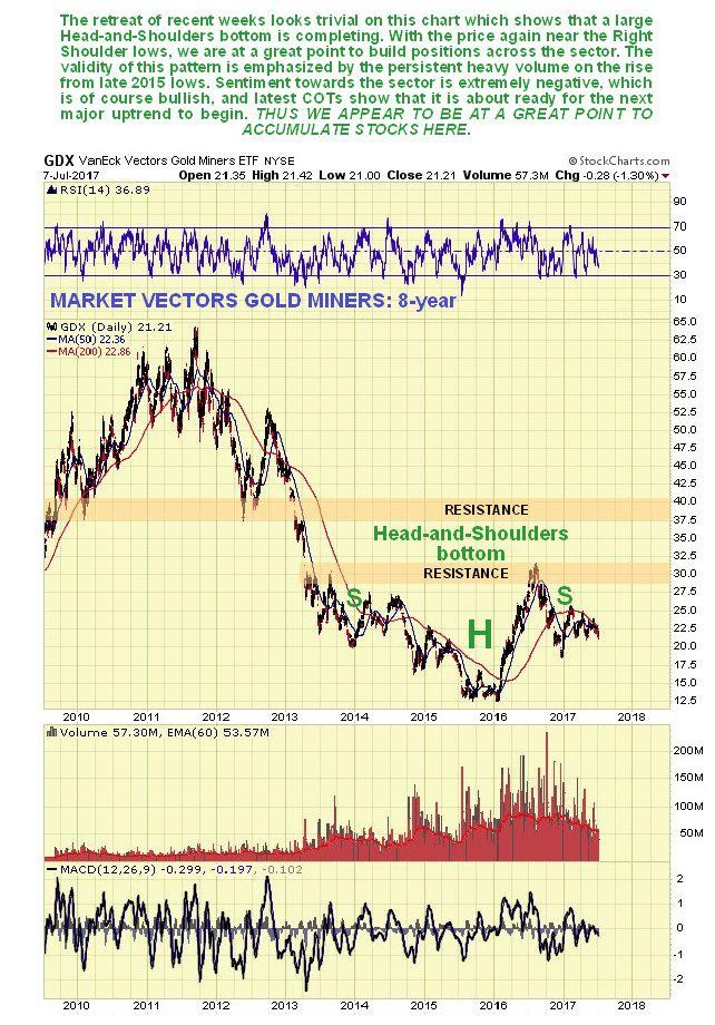The long-term 8-year chart for gold stocks proxy GDX shows a large Head-and-Shoulders bottom pattern completing that closely corresponds with the one completing in gold itself, and the validity of this pattern is emphasized by the persistent strong volume on the rise out of the “Head” of the pattern, from the late 2015 lows. With the price now near to the Right Shoulder lows of the pattern, we are believed to be at a great point to build positions in Precious Metals stocks, especially as we have the luxury of knowing that sentiment towards the sector is awful, meaning that the mob won’t touch these stocks with a 10-foot pole, same as late in 2015, with COTs now looking strongly bullish too, and any further short-term decline will simply change the picture from very bullish to extremely bullish.