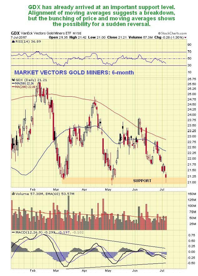 The 6-month chart for GDX shows the action of recent weeks in detail and how it is dropped down to a support level. Even if this is breached, the bullish factors mentioned above are expected to lead to a reversal to the upside before long.