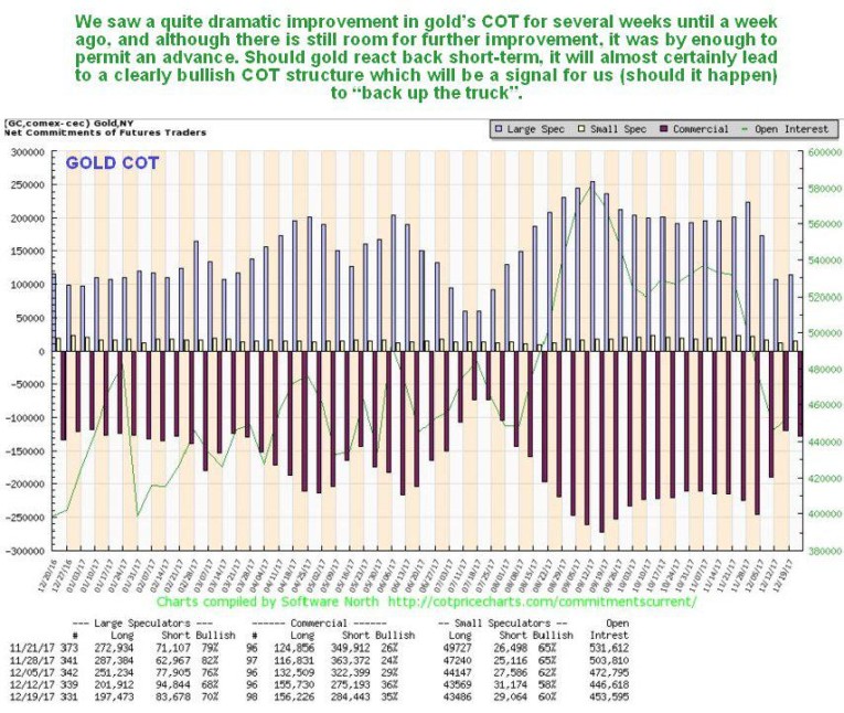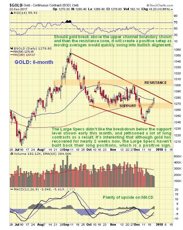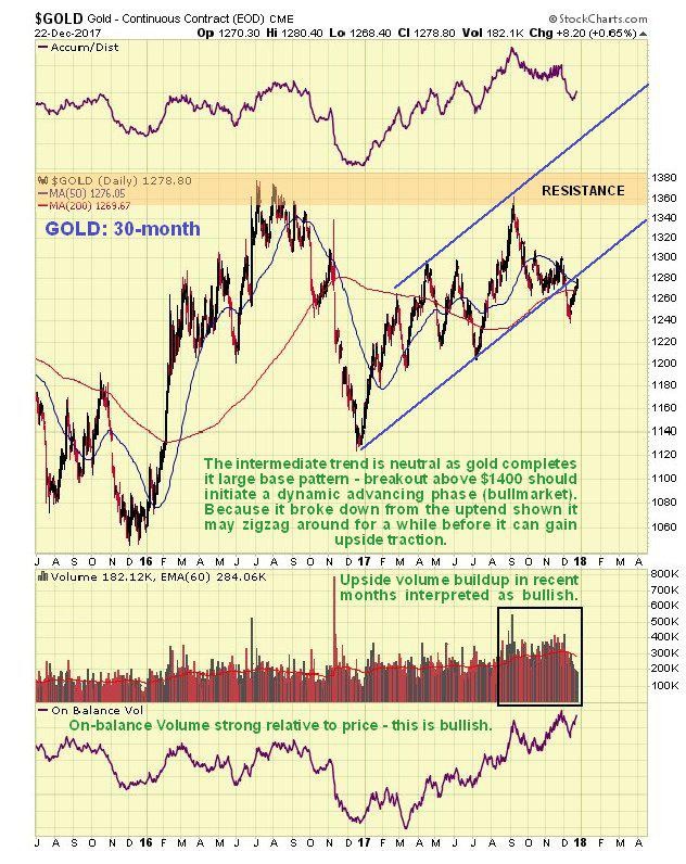 On its 10-year chart we see that gold is in the late stages of a large Head-and-Shoulders bottom, which it is expected to break out of not far into 2018. This is a huge base pattern that can support major bullmarket. Points worth noting on this chart are the marked volume buildup during the last half of the year and the steady rise in volume indicators this year, especially the On-balance Volume line – these developments suggest that gold is building up to something, after being a sideshow during 2017 due to rising stockmarkets and the cryptocurrency mania. The key level to note is $1400 – a breakout above this level will signify that gold is leaving behind the base pattern to enter a new bullmarket phase.