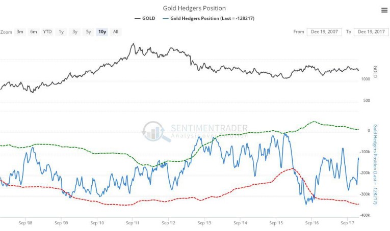 The latest gold Hedgers chart shows Hedgers positions to be squarely in neutral territory, and this chart thus provides no guidance one way or the other…
