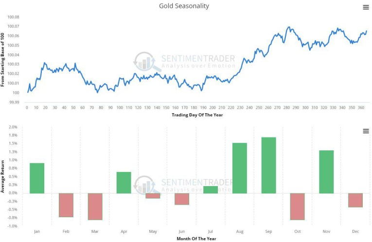 The following chart shows that seasonal factors are quite bullish for gold in January, after being rather negative in December…