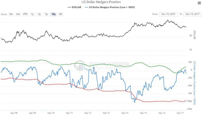 However, there are two opposing factors on the other side of the scales that we must weigh against the bearish looking dollar index chart. One is the latest dollar Hedgers chart, which shows that Hedgers’ positions are at levels that have in the past led to rallies…