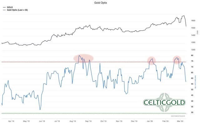 Sentiment Optix for Gold as of March 13th, 2020. Source: Sentimentrader