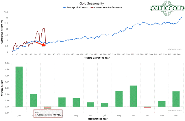Seasonality for Gold as of March 13th, 2020. Source: Sentimentrader
