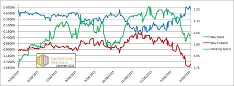 We finally switched from looking at the March silver contract to the May. First Notice Day for March is a week from Monday and the bases are becoming very volatile. That said, and unlike in the past, the silver basis for March is still positive. We coined the term temporary backwardation, because contracts for gold and silver—and silver much more than gold—tended to tip into backwardation as they approached expiry. Not in silver now, at this price.