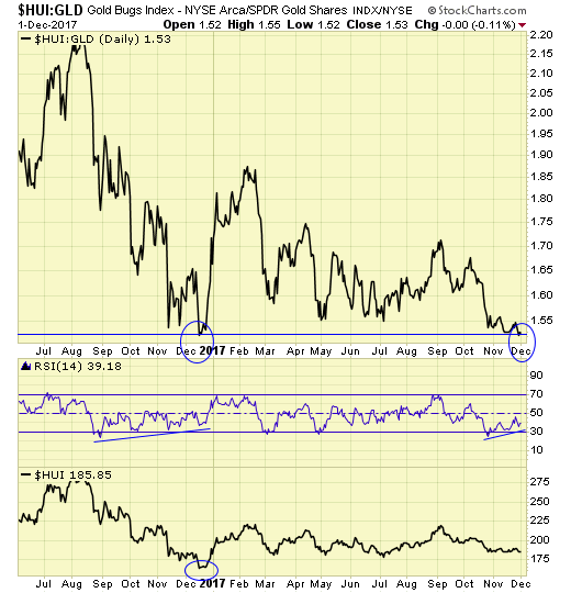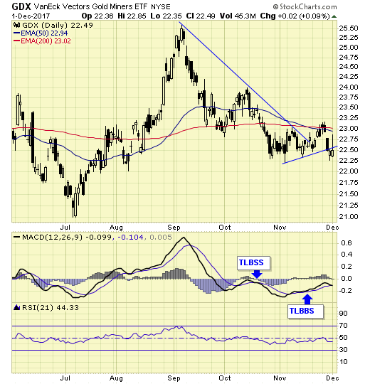 ABX is a major component in the gold stock indices and ETF. On 11/30 it gapped down on heavy volume and closed the day with a doji, suggesting price exhaustion.