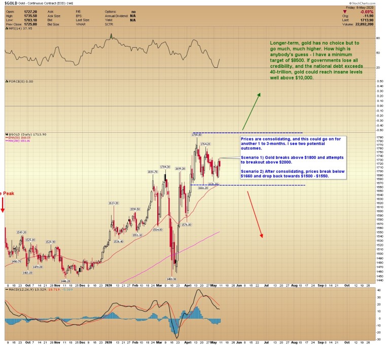 Longer-term, gold has no choice but to go much, much higher. How high is anybody's guess - I have a minimum target of $8500. If governments lose all credibility, and the national debt exceeds 40-trillion, gold could reach insane levels well above $10,000.