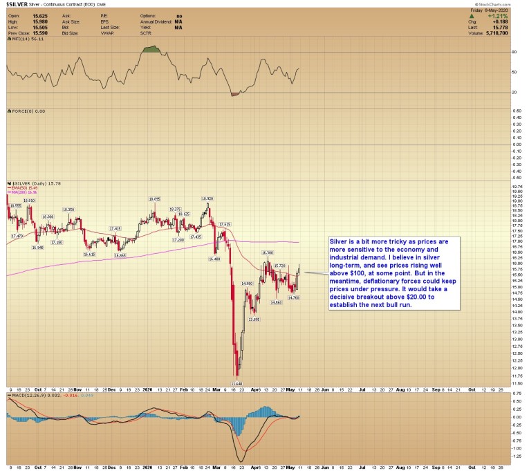 Silver is a bit trickier as prices are more sensitive to the economy and industrial demand. I believe in silver long-term, and see prices rising well above $100, at some point. But in the meantime, deflationary forces could keep prices under pressure. It would take a decisive breakout above $20.00 to establish the next bull run.