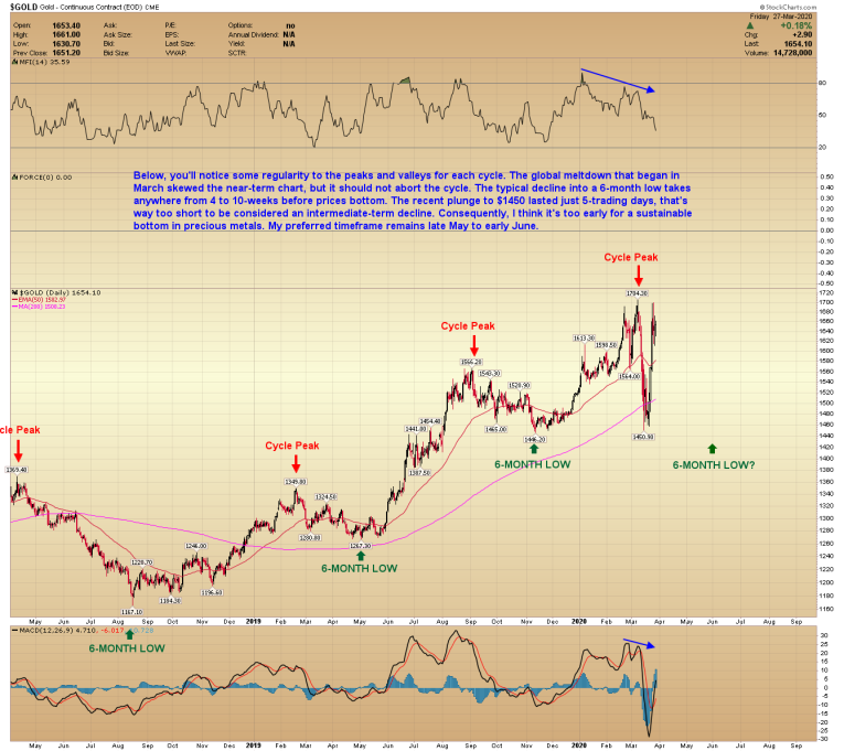 Below, you’ll notice some regularity to the peaks and valleys for each cycle. The global meltdown that began in March skewed the near-term chart, but it should not abort the cycle. The typical decline into a 6-month low takes anywhere from 4 to 10-weeks before prices bottom. The recent plunge to $1450 lasted just 5-trading days, that’s way too short to be considered an intermediate-term decline. Consequently, I think it’s too early for a sustainable bottom in precious metals. My preferred timeframe remains late May to early June.