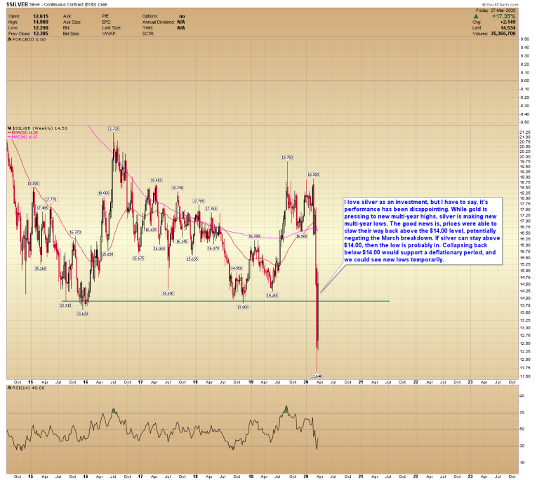 I love silver as an investment, but I have to say, its performance has been disappointing. While gold is pressing to new multi-year highs, silver is making new multi-year lows. The good news is, prices were able to claw their way back above the $14.00 level, potentially negating the March breakdown. If silver can stay above $14.00, then the low is probably in. Collapsing back below $14.00 would support a deflationary period, and we could see new lows temporarily.