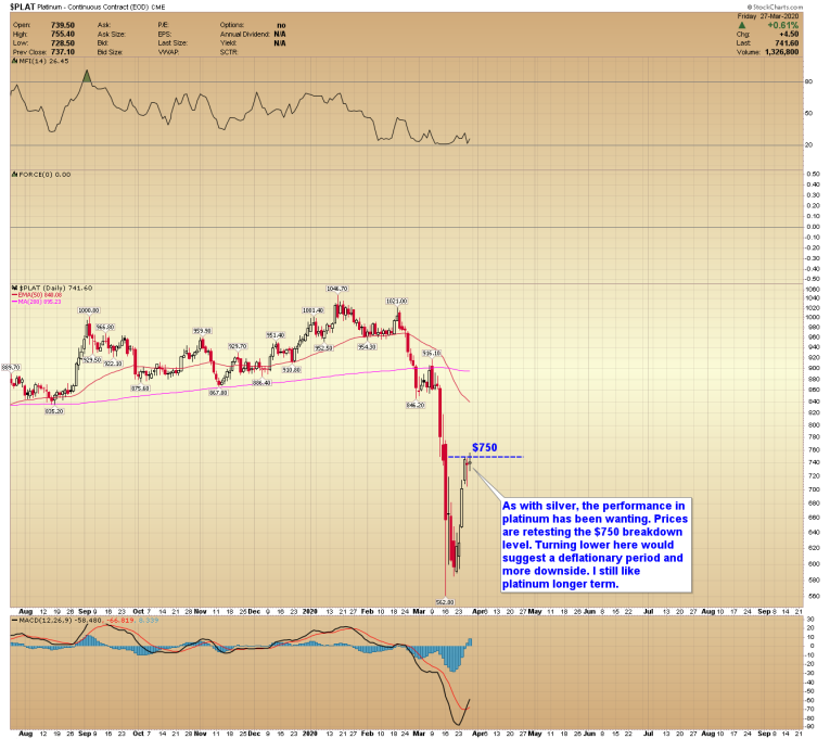 As with silver, the performance in platinum has been wanting. Prices are retesting the $750 breakdown level. Turning lower here would suggest a deflationary period and more downside. I still like platinum longer term.