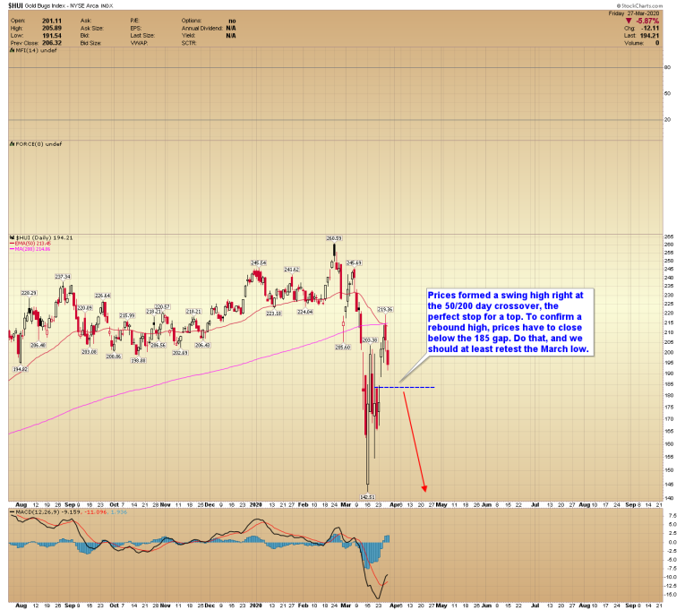 Prices formed a swing high right at the 50/200 day crossover, the perfect stop for a top. To confirm a rebound high, prices have to close below the 185 gap. Do that, and we should at least retest the March low.