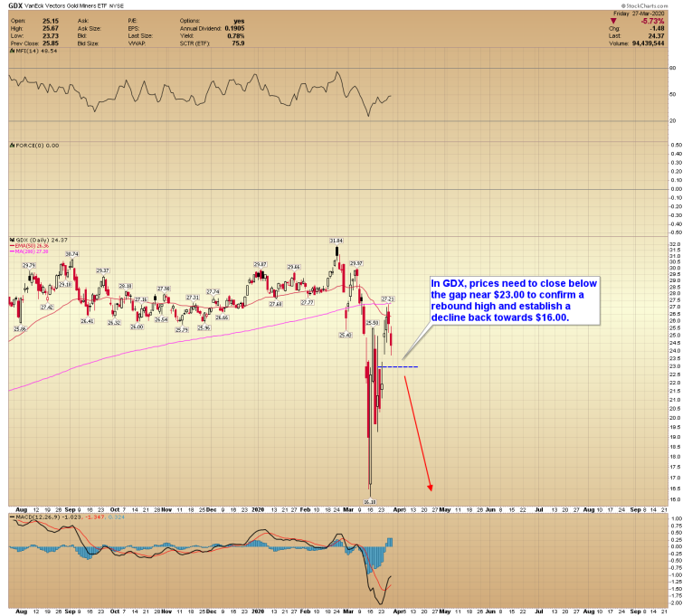 In GDX, prices need to close below the gap near $23.00 to confirm a rebound high and establish a decline back towards $16.00.