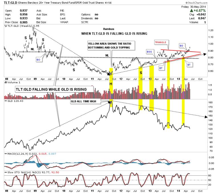 This next chart I would like to show how the TLT, 20 year bond, is doing compared to gold. This chart has been speaking volumes to me as it does a good job defining the big trends in gold. As you can see when the TLT is under performing gold the yellow metal rises. Since gold made its bull market top in 2011 the ratio has been steadily rising carving out a massive H&S bottom. This ratio formed a red triangle right on top of the neckline that strongly suggested that this ratio would begin to rise once the breakout and backtest occurred. Note the last bar on the far right hand side of the chart that shows this ratio in now starting to takeoff as all the work is done. This chart is telling us the decline in gold isn’t going to end anytime soon. Yes we could get a short term rally but not a major rally at this time IMHO.