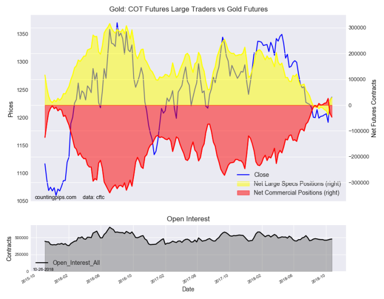 The non-commercial futures contracts of Gold futures, traded by large speculators and hedge funds, totaled a net position of 29,388 contracts in the data reported through Tuesday October 23rd. This was a weekly increase of 11,721 contracts from the previous week which had a total of 17,667 net contracts.