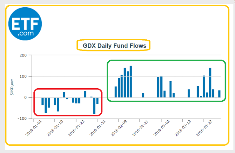 While institutional money is pouring out of stock market ETFs, it’s starting to pour into the GDX gold stocks ETF.