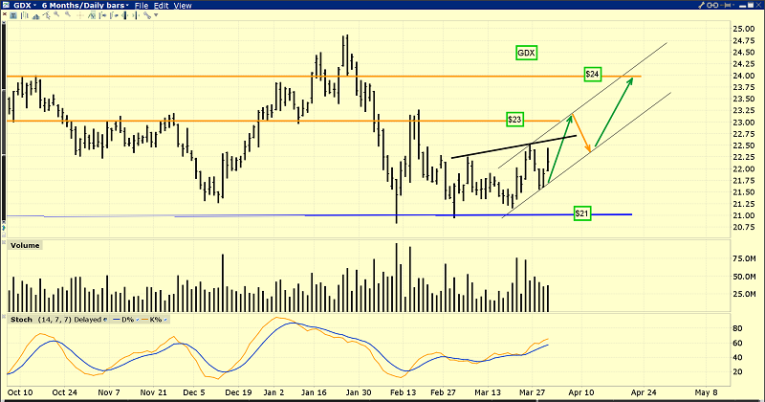 This is the GDX chart. I’ve urged gold stock investors to be eager buyers of all two and three-day pullbacks. Aggressive players can buy GDX call options and look for 20% gains on those options as a profit booking target.