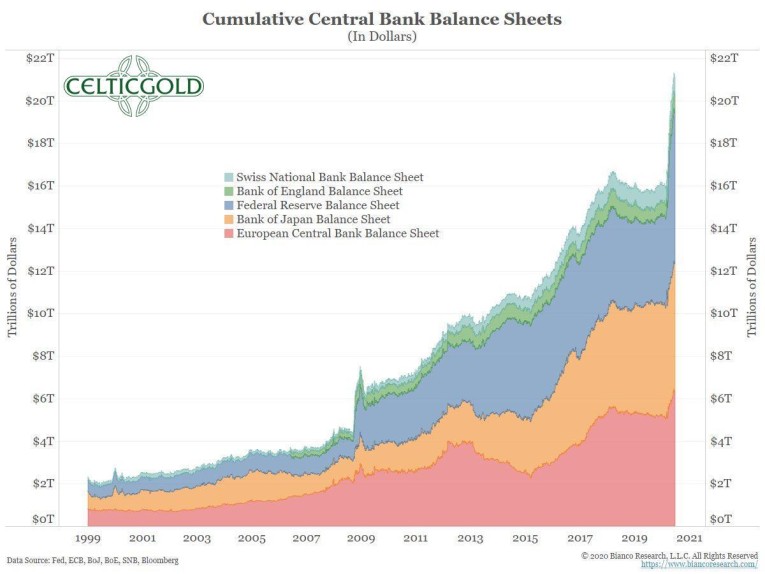 Ultimately, the main reason for the rising gold price is quite simply to be found in the extreme balance sheet expansions of all central banks on this planet. These ever-increasing money supply expansions already caused the bull market in precious metals to begin in 2001, but since the financial crisis of 2008, the exponential thrust has been followed by a further increase in the rising trend. This year, the corona crisis has again provided an even greater exponential thrust. Hence, it is quite obvious to expect a further intensification of this trend and thus a further exploding money supply in the coming years.