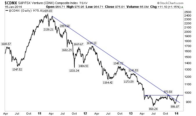 The TSX Venture (CDNX) is the market for juniors in Canada. The market consists of exploration companies focused on precious metals and other minerals, energy companies and some technology companies. It’s not a perfect indicator for the junior mining industry but it’s good enough for the experts. On Thursday the CDNX closed at a nine month high. No, that is not a misprint. The junior market reached a nine month high. It bottomed in late June, made a higher low in December and has surged 10% since.