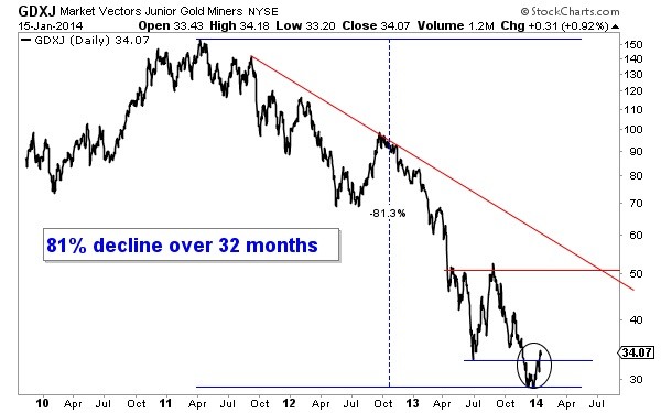 GDXJ declined 81% from its April 2011 peak to its December 2013 bottom. As we noted several weeks ago (https://www.gold-eagle.com/article/gold-and-silver-stocks-lead-metals-higher ), GDXJ tried to penetrate its December low three times and failed. The market has since rallied back above the previous (June) low. Given the severity of the bear in terms of price and time, extreme negative sentiment and recent bullish price action I believe it is highly likely that the bottom is in.