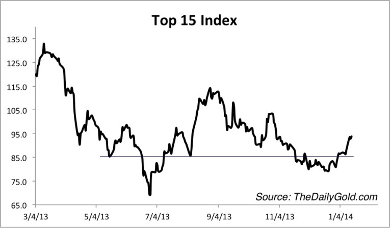 Most of the stocks that we follow bottomed in June. The following chart, which was sent to premium subscribers is an equal weighted index of 15 of our favorite gold and silver stocks. The index bottomed in late June 2013 and made a strong higher low in December. It would have to decline 26% to test the June low.