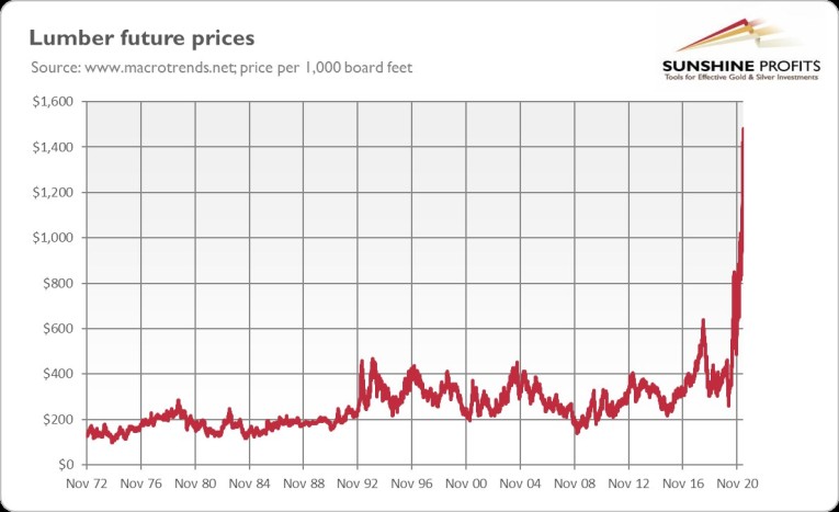 There’s no inflation … None at all. Only, completely by accident, lumber prices are skyrocketing. Gold is likely to remain silent, but it may catch up later.