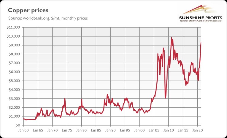 What a surge! It happened because of the limited supply and strong demand for new houses. But it’s not just lumber. Many raw commodities are rallying too. The price of copper, for example, has just approached its record height (from February 2011), as the recovery of the global economy boosted demand. Just take a look at the price below.