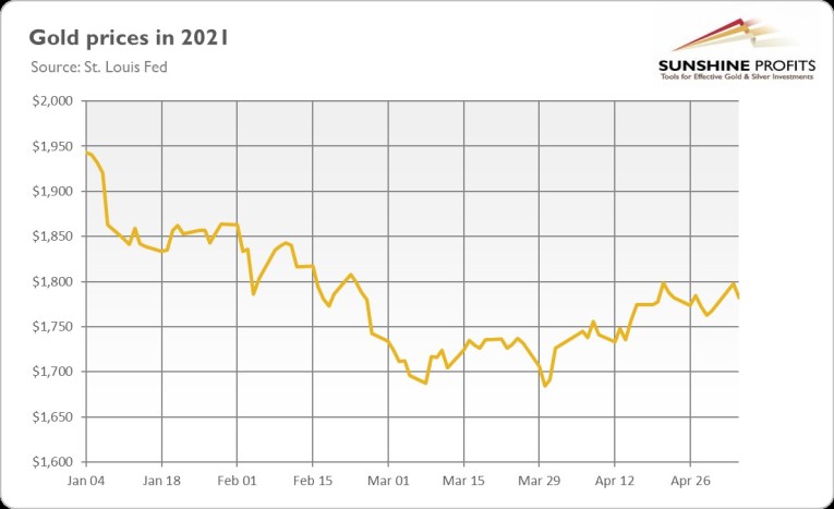 There was a big divergence during the pandemic when commodities plunged, while gold at the same time shined brightly as a safe-haven asset. So, the current lackluster performance of the yellow metal is perfectly understandable during the economic recovery.