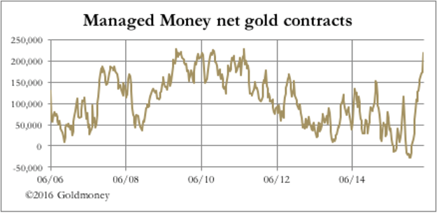Gold had become very overbought, with the Managed Money category noticeably long, as the next chart shows.