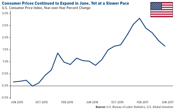 Consumer prices rose slightly in June at their slowest pace so far this year. The consumer price index (CPI), released on Friday, showed the cost of living in America rising only 1.6 percent compared to the same month last year, significantly down from the most recent high of 2.8 percent in February and below the Fed’s target of 2 percent. Much of the decline was due to energy prices, which fell 1.6 percent from May.